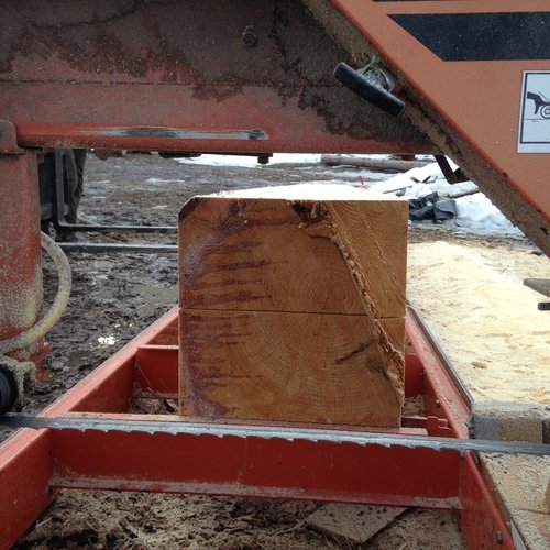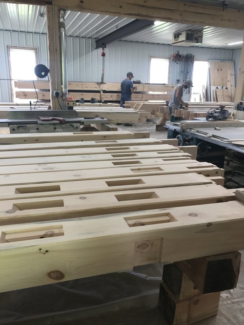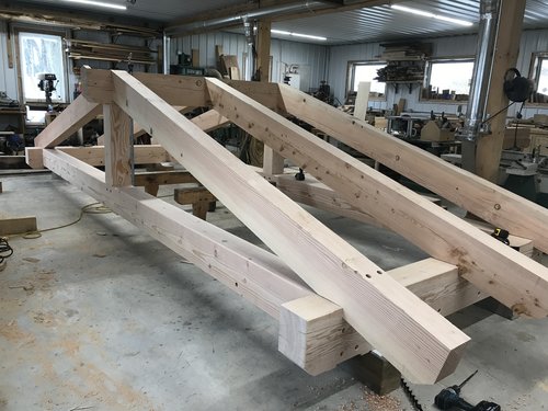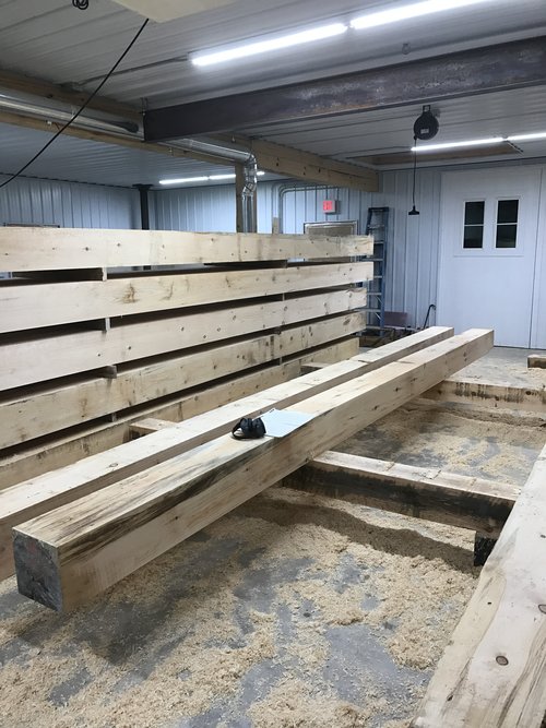 We prefer locally harvested eastern white pine for our frames. It is light, strong, stable, abundant, and a joy to work with a chisel. We contract with local loggers and sawmills for clear, straight pine cants (over-sized timbers). We allow these cants to air dry for a minimum of two years before we re-saw the timbers with our band-mill to exact dimensions. This has been found to be the best practice to ensure the timbers enter the shop straight, square, and consistent. The drying time also minimizes movement once the frame is erected.